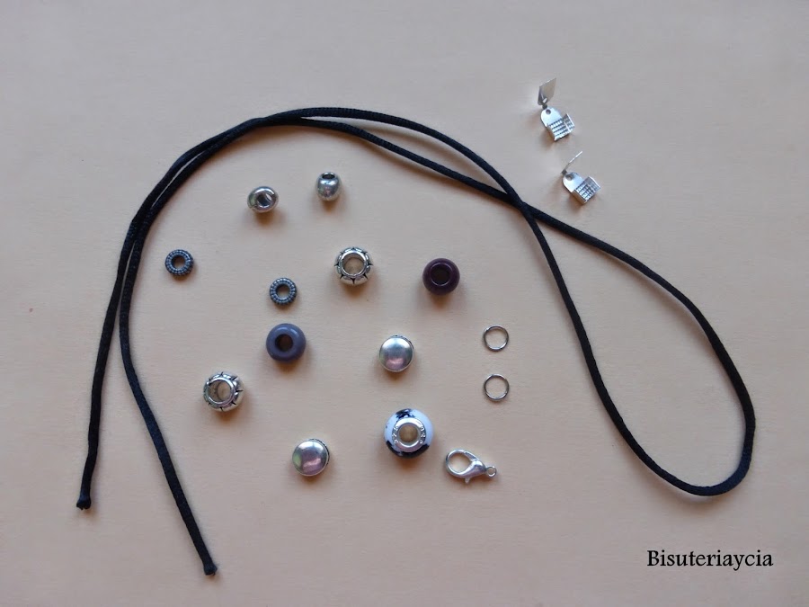 Los materiales que vamos a utilizar son muy sencillos cola de ratón del color que mas os guste, abalorios varios (entrepiezas, piezas "estilo Pandora", bolas de colores...), terminales, anillas, y cierre.