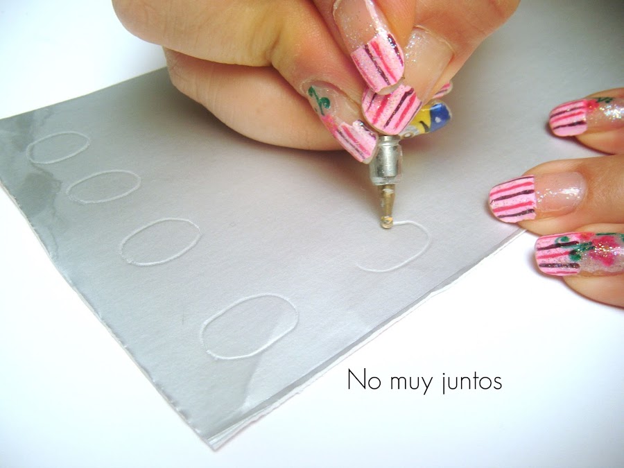 2) Ahora en la parte interna, es decir, donde esta el aluminio con un lápiz, plumón o un punzón vamos a dibujar óvalos de un tamaño aproximado al de nuestras uñas.