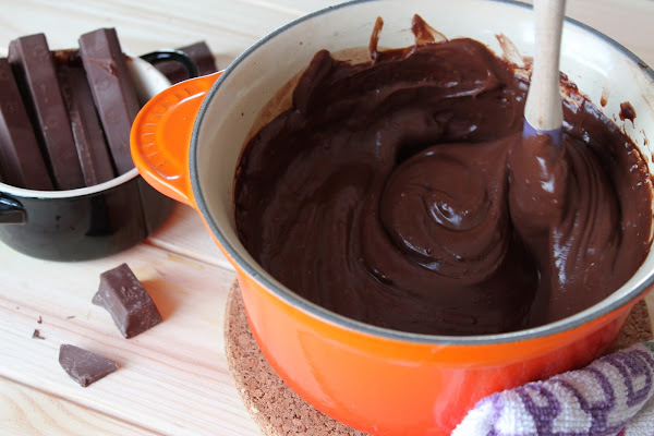 7. Cuando espese retiramos del fuego y añadimos el cacao negro troceado, mezclándolo bien hasta que esté totalmente fundido.