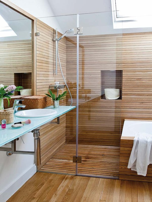 * El área mínima para colocar una ducha que resulte cómoda debe ser de unos 90x90cm, y un área de unos 150x70cm para una bañera standard. La clave de este tipo de baños para optimizar el espacio es hacer que el propio suelo de la ducha sea el acceso a la bañera. De esta forma, ganamos los metros que habría que dedicar al pasillo que separa ambos elementos. Coloca el rociador de la ducha en el techo y usa un material versátil que sirva como pavimento de ducha y de revestimiento para paredes y bañera, unifique y cree un espacio único, como las piedras en cualquiera de sus versiones o la madera.