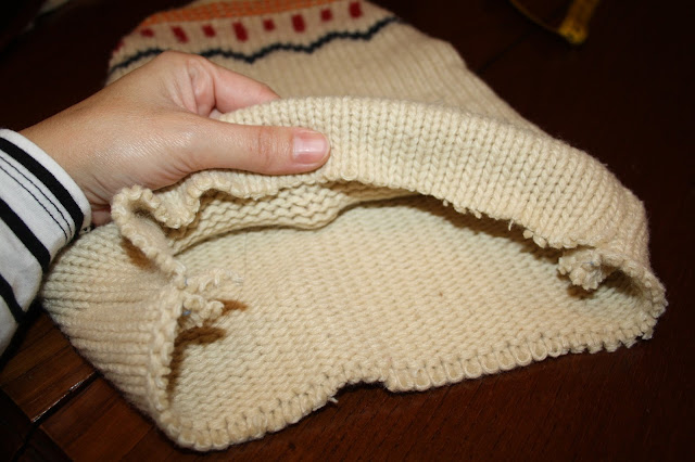 Marcamos con tiza un trozo en forma de gorro largo, desde el bajo del jersey hacia la parte de arriba, como veis en la foto. Siempre va a ser mejor que sobre, que no que falte, así que no tengáis miedo en cortar de más.