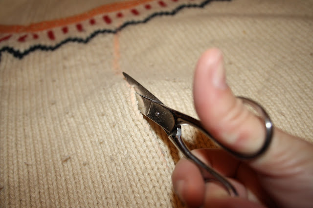 Como me quedó demasiado largo, tuve que cortar la cenefa (que es la parte del bajo del jersey) porque pretendía aprovechar el dibujo del final.