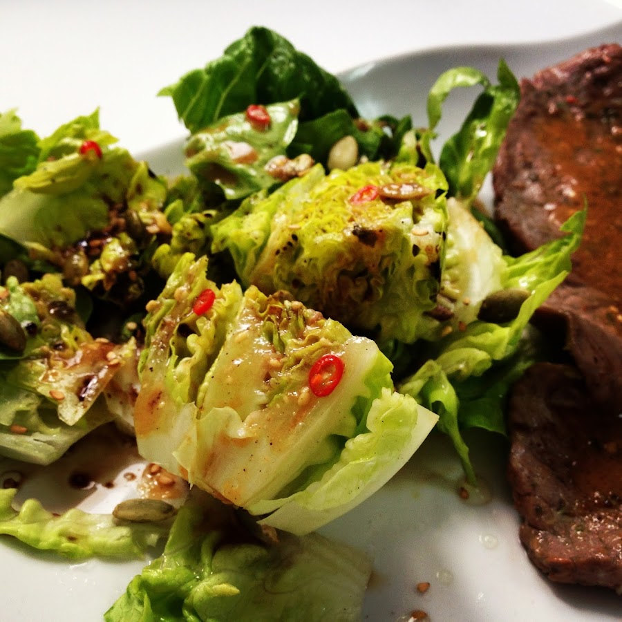 Para hacer la ensalda simplemente lavamos un cogollo de lechuga, lo aliñamos con aceite, sal, vinagre de modena y un poco de reducción de la salsa que hemos hecho. Le podemos añadir unas pipas de calabaza, un poco de sésamo y si lo queremos picante un poco de pimiento chilly picado.