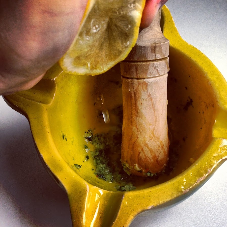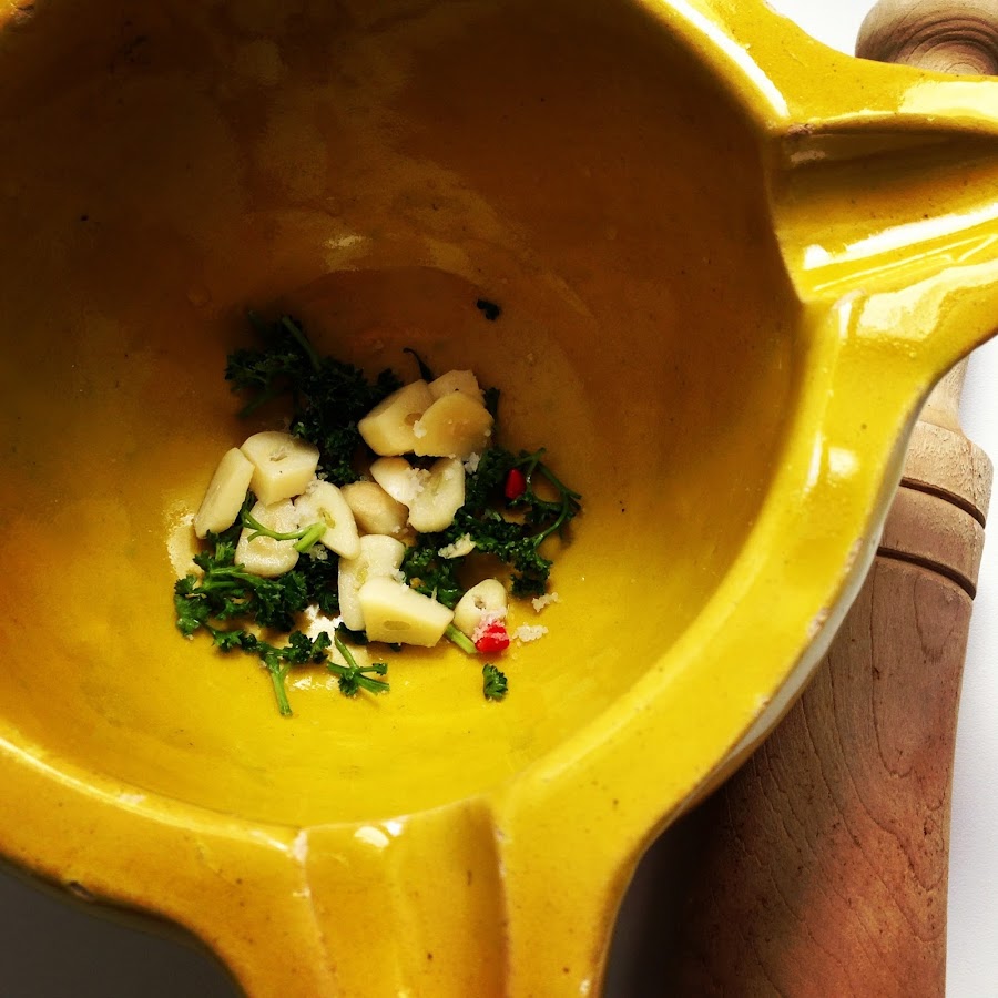 En un mortero ponemos unas hojas de perejil cortadas, 2 ajos troceados, una punta de pimiento chilly y sal y lo machacamos todo.