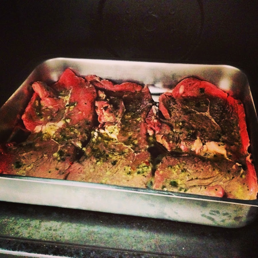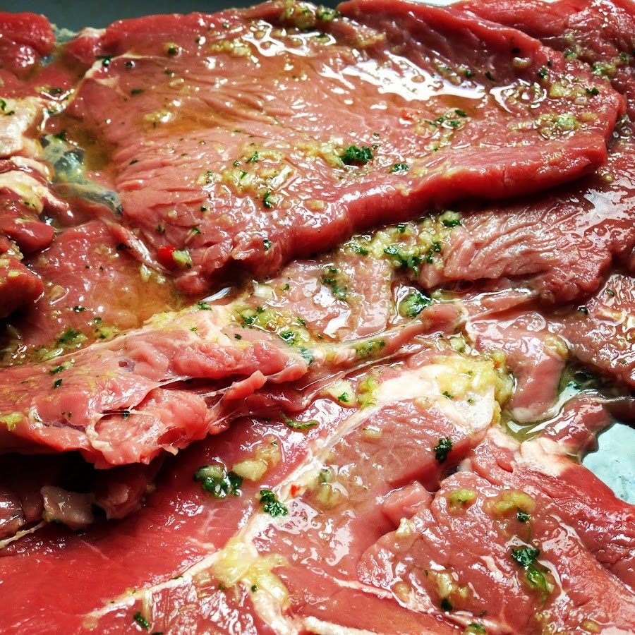 Lo mezclamos bien y lo utilizamos para untar los filetes. Untamos generosamente las dos partes de cada filete y los dejamos reposar. Si tenemos tiempo los dejamos así durante una hora para que los sabores vayan penetrando en la carne.