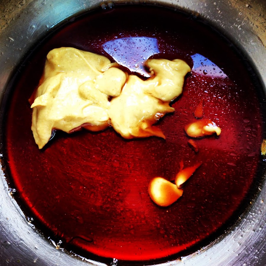 En un recipiente pequeño ponemos el 1/4 de Pedro Ximénez y las tres cucharadas de mostaza de Dijon. Lo removemos y le añadimos el jugo de la carne que habiamos reservado y si nos ha sobrado algo de mezcla de especias también se lo podemos introducir. Lo removemos todo y reservamos.