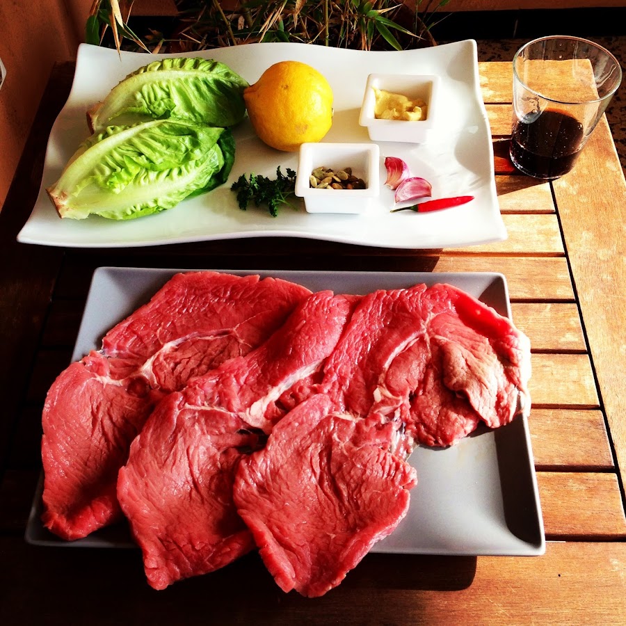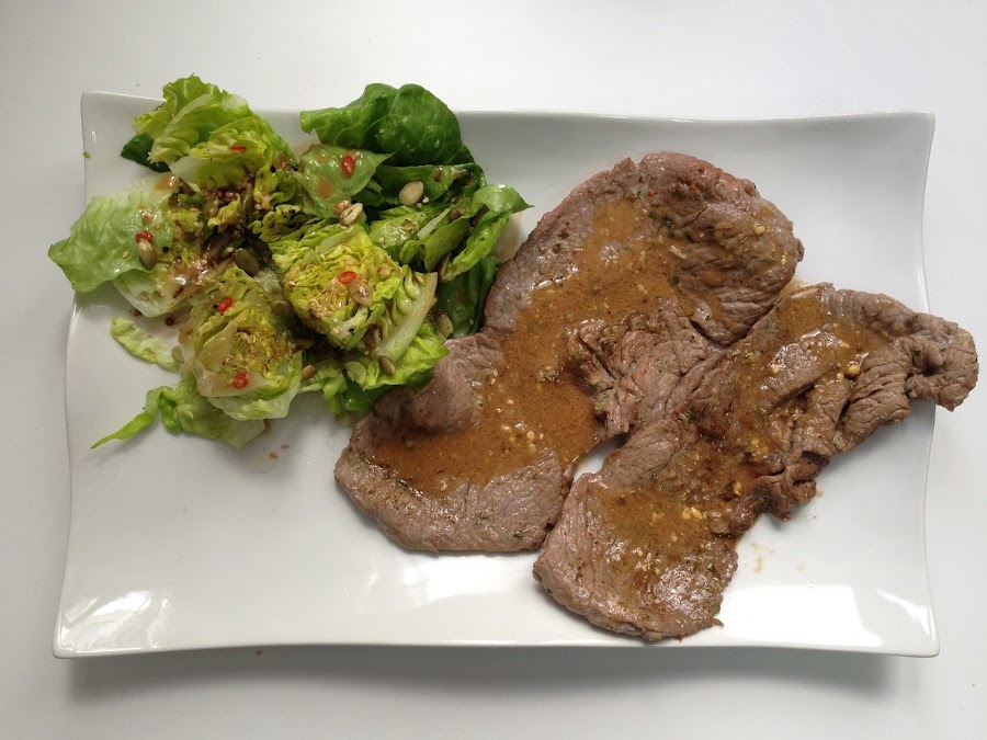 Para servir simplemente debemos procurar que la carne y la salsa estén bien calientes. Servimos la ración de ensalda y uno o dos filetes regados con la reducción de salsa.