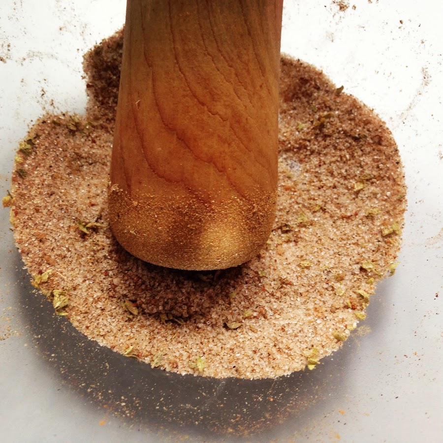 En un bol ponemos las 2 cucharadas de azúcar, pimienta molida, mejorana, comino, laurel en polvo, canela y nuez moscada (las especias pueden ser al gusto y en cantidades también al gusto. El azúcar si debe estar siempre presente).