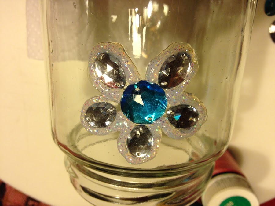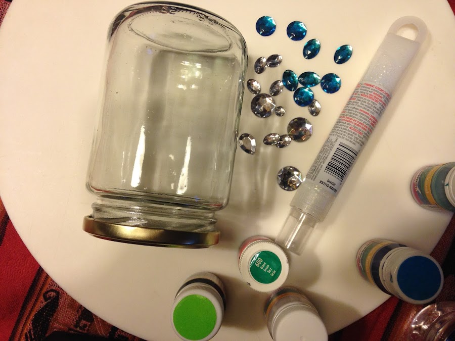 Materiales: frasco de vidrio, pasta relevo para falso vitraux, pegamento transparente, adornos brillantes facetados. Limpiar el frasco con alcohol antes de trabajar.