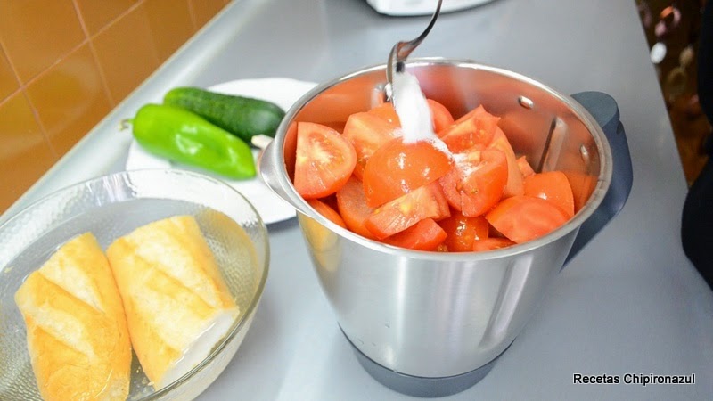 Pon los trozos de tomates en el vaso batidor con una cucharadita de sal y bate durante 3 min/vel progresiva 5-10.