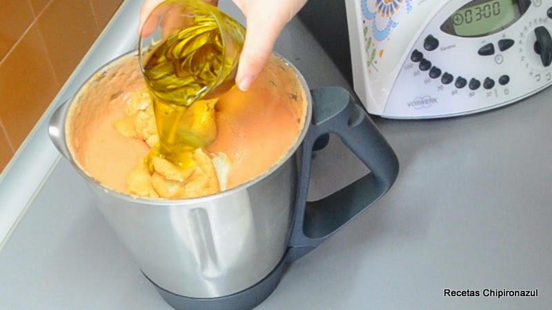 Añade el pan, un vasito de aceite de oliva, medio vasito de vinagre y media cucharadita de sal.