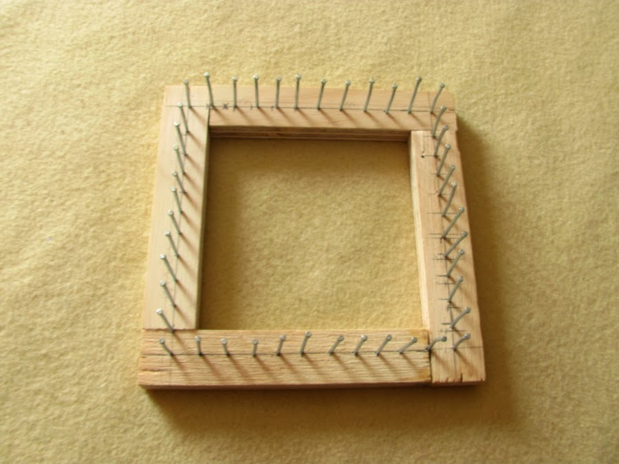 TELAR DE PUNTILLA DE 11 X 11 CM : este telar se trabaja con la misma técnica que el anterior, solo que, por ser motivos o pastillas mas pequeños los que se obtienen, da lugar a realizar una amplia gama de proyectos, desde zapatitos para bebés, chambritas, bolsas, colchitas y demás. Realizar este telar en casa, es muy fácil y rápido, en el blog ya existe un apartado con el tema cómo hacer tu propio telar de puntilla.