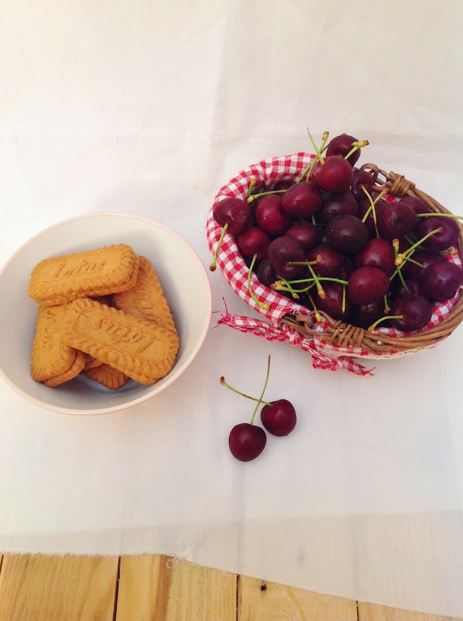 Bueno, y no os digo nada de la combinación que hacen las cerezas con las galletas speculoos. Estas galletas caramelizadas están increíblemente buenas y ya empiezan a comercializarse por todas partes, incluso en el Mercadona. Hay también una crema de estas galletas que es ¡mortal! Todavía no he hecho ninguna receta con ella y ya me he comido un bote. ¡Madre mía! Mi operación bikini....