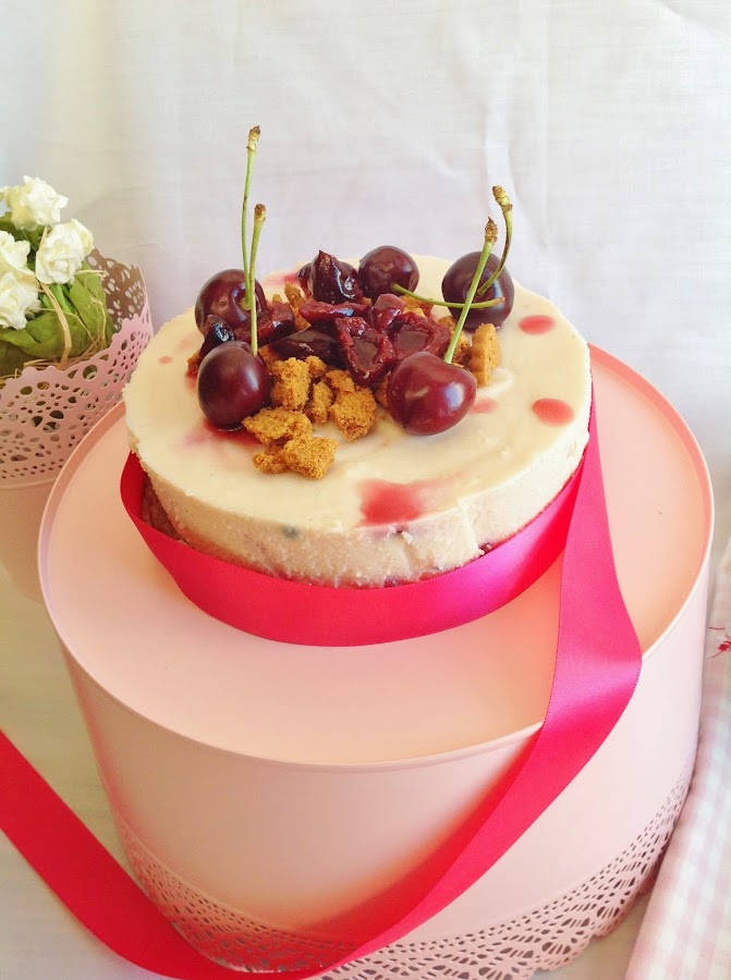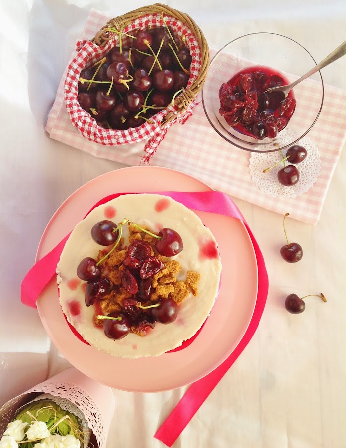 Tenía unas cerezas en el frigo desde hace una semana, y no sé cómo, pero se conservan como el primer día. Menos mal porque así he podido utilizarlas. Claro, que ese no era mi primer objetivo. El primer objetivo era hacer este cheesecake con cerezas en almíbar que había comprado para una receta anterior, pero esas ya estaban fermentadas (¡a ver, después de dos meses...!). Por eso, he utilizado las que tenía frescas y las he hecho en almíbar. ¡Qué receta más buena! La he encontrado en el blog Directo al paladar y me ha encantado. Las cerezas son una de mis frutas preferidas del verano. A mi peque le ha encantado esta tartita y es que al llevar fruta fresca en almíbar hecha en casa, se nota la diferencia.