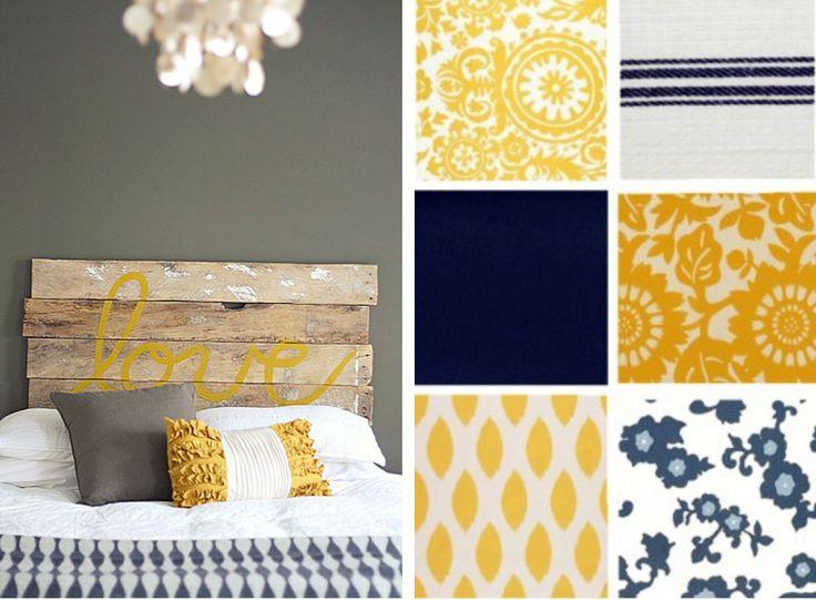 Esta mezcla con un tablero a modo de cabecero y combinado con estos colores azules y amarillos, estampados florales y geométricos es ideal para crear un ambiente rústico chic.