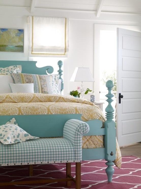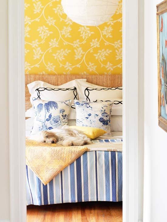 En primer lugar puedes utilizar el amarillo en todas su gama, desde beiges pasando por el amarillo limón hasta el tono huevo, para crear distintos estilos de dormitorio. Romántico, con un toque bohemio,cottage utlilizando en mayor o menor medida los estampados, predominando tonos cálidos en textilies, y papeles pintados por ejemplo .