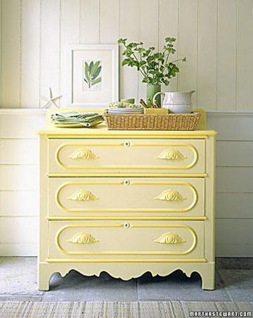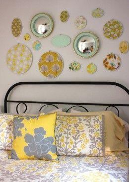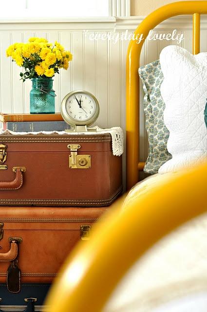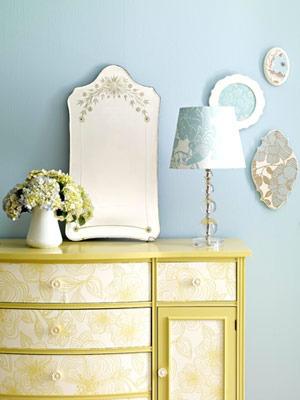 Alguna mesita, quizás alguna cómoda o hasta un aparador como el de más abajo puede dar mucha personalidad a tu dormitorio. Si tienes espacio para una zona de lectura, un sillón con un estampado en estos tonos te puede quedar precioso y como final si no ten convences, pon simplemente unos toques divertidos como unos marcos reciclados ouna pequeñalámpara o un sencillas margaritas amarillas ,crisantemos o cualquie flor de dicho color darán un punto de alegría a tu habitación.