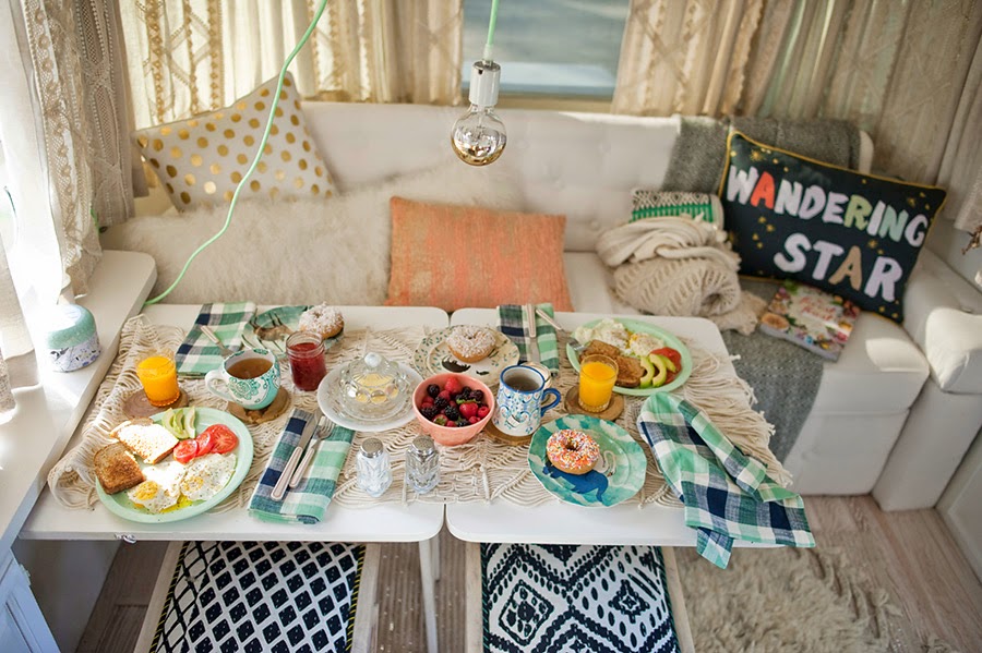 De la mano de ANTHROPOLOGIE, restauró y decoró todo el remolque con productos que inspiran belleza y conexión con la naturaleza. Su colección para el hogar hace que cada pieza llene el espacio con un significado. Buscaban una casa sobre ruedas con la que viajar por todo el país y sentirse como en su propia casa de forma cómoda y a la vez estimulante. Con esta idea se adentran en la aventura de forma creativa sintiéndose libres y algo salvajes, así que la llamaron "Wandering Star".