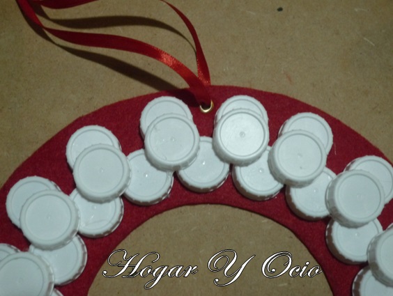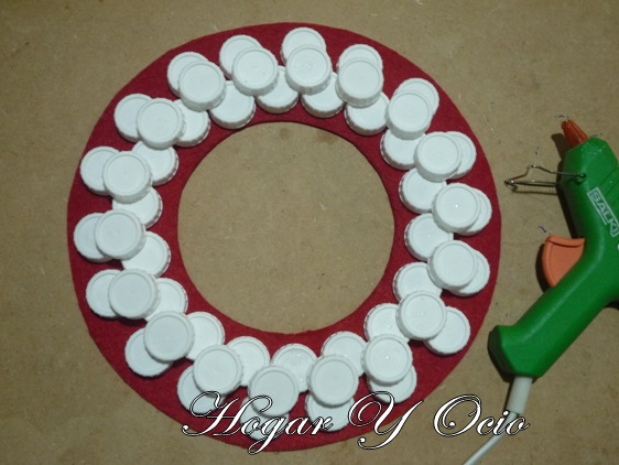1. Cortamos un aro de fieltro teniendo en cuenta las dimensiones que queremos para la corona y el espacio que ocuparán los tapones.