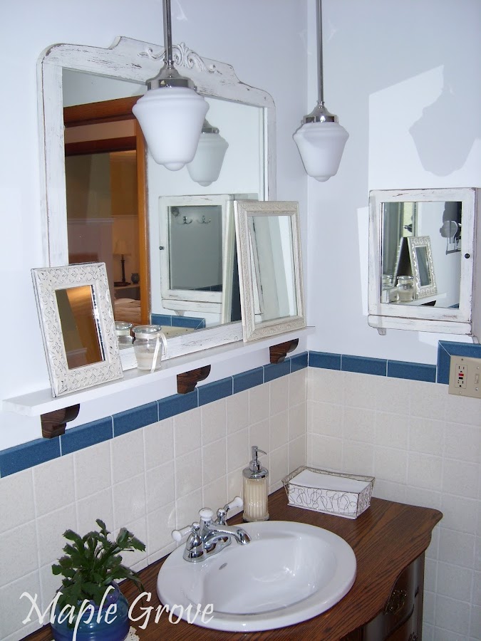 3.Este mueble se ha pintado en un gris azulado. Se han conservado los tiradores y molduras antiguas, que le otorgan carácter, y para contrarrestar su escasa altura se ha añadido un amplio lavabo de sobremesa.