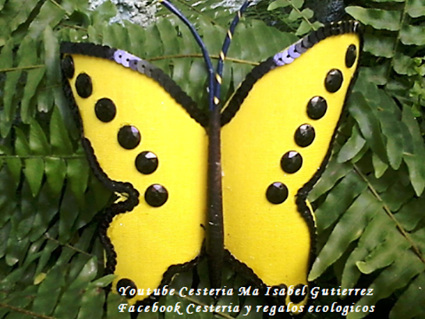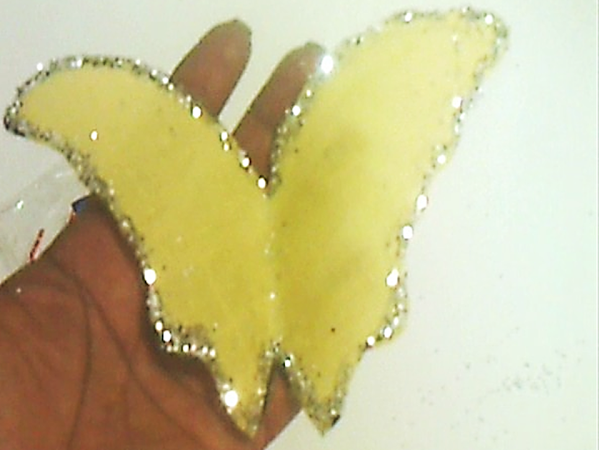 La decoracion es al gusto, en este caso le pegue una tira de lentejuelas por toda la orilla de la mariposa y algunas falsas gemas, pero tambien podemos usar diamantina o chaquira...