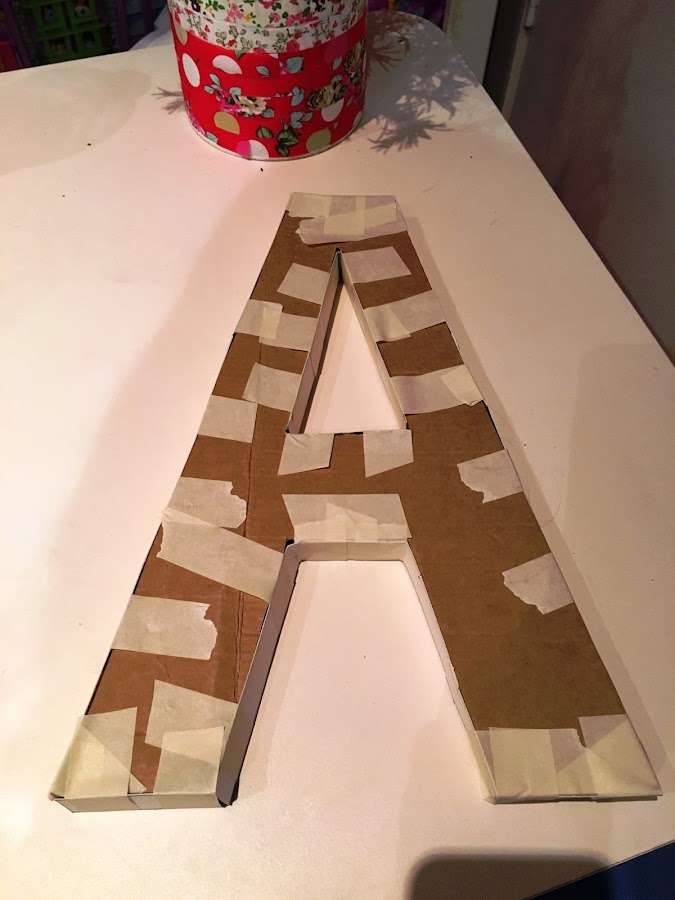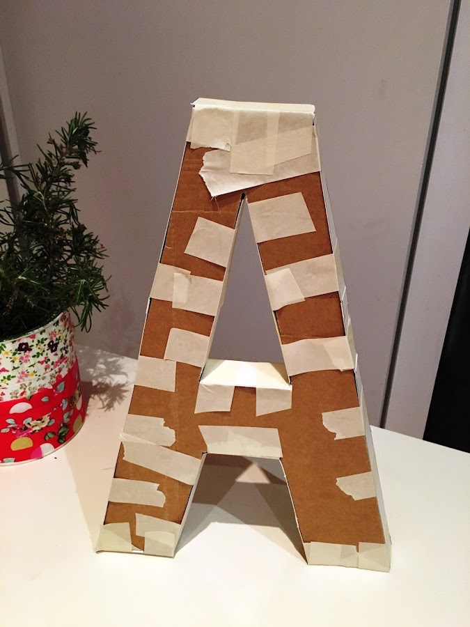 Ahora falta tapar/rellenar los lados de nuestra letra con un cartón un poco más fino, yo uso el de las cajas de las galletas/cereales. Recortamos las tiras y sujetamos con la cinta de carrocero, y digo de carrocero porque es una cinta mate no impermeable, porque luego al poner la cola se adhiera bien, con el celo resbalaría.