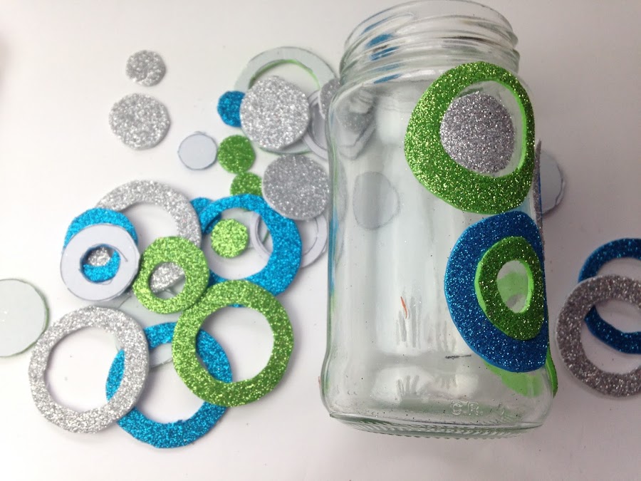 Sacar el papel de atrás de los círculos y pegar en el frasco directamente, presionando con los dedos. Ubicar las figuras a gusto completando todo el frasco.