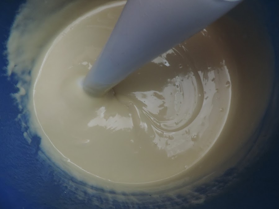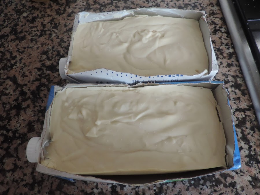 Cuando ya esté bien atada la mezcla y tenga la consistencia de una mayonesa o crema, se echa en moldes, yo utilizo cajas de leche cortadas.