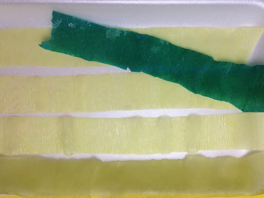 Para hacer las flores cortar tiras de papel crepe de color beige y verde. Aplicarle a cada tira una mano de barniz o silicona mezclada con alcohol. Dejar secar
