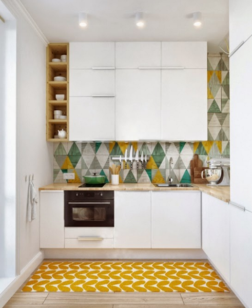 Ya en la cocina, que es totalmente abierta, destacan de nuevo los materiales y la perfecta mezcla de colores: blanco, verde, gris y mostaza. Tiene lo imprescindible para tenerlo todo en orden y sin agobios, y la simetría de sus lineas junto con el color, hacen que parezca una cocina ideal.