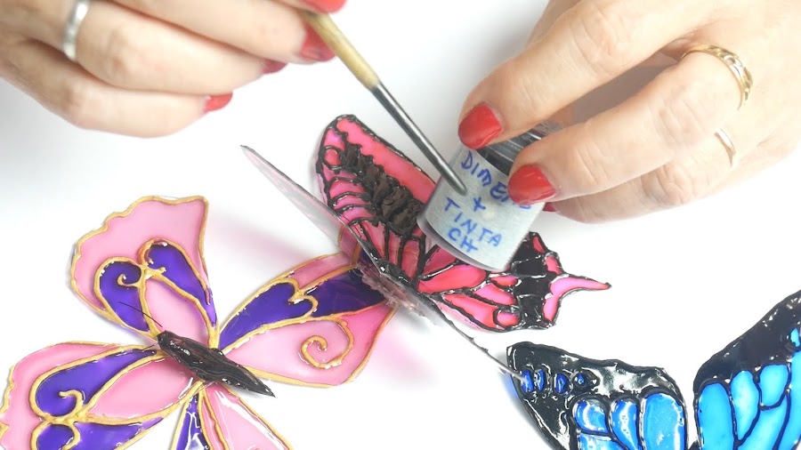 A esta mariposa yo había pintado el cuerpito con el mismo color de laca, pero para las que no lo tienen pintado voy a emplear la laca negra