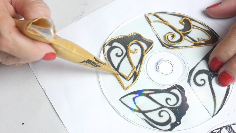 Para comenzar a trabajar coloco el disco sobre las figuras recortadas y voy a delinear utilizando la pintura dimensional que les enseñé a hacer pero cualquier pintura dimensional que posean sirve.