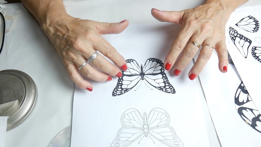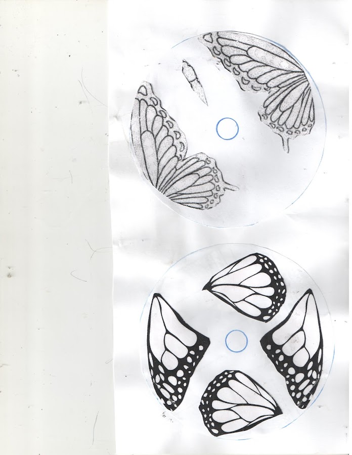 Sobre un papel marco el centro y los límites del cd, si la mariposa no es muy grande puedo recortarla por la mitad y ubicarla dentro del círculo, pero si es de un tamaño mayor tengo que recortar las 4 alitas para que quepan dentro de mi espacio.