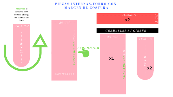 2. Medir el contorno de las piezas curvas para sacar el ancho de base y el ancho del forro.