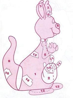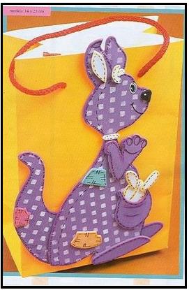 Fotocopia el molde de acuerdo al tamaño de la bolsa que eliges, y recorta las piezas; transfiere el diseño a la Goma Eva, según te gusten los colores y combinaciones, recorta. Una vez lists las partes, con marcador indeleble fino realiza un pespunte (- - - x-x-) y luego con pistola encoladora une las piezas. Por último adhiere el canguro a la bolsa y listo, ya tienes una bonita bolsa regalable, como puedes ver en la foto.