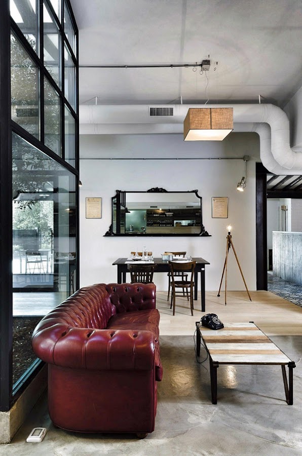 Aquí se ha creado otra zona de relax, gracias a varios sillones de cuero, unos bancos y una chulísima mesa con tablero de madera reciclada y ruedas (la tenéis casi igual en la tienda online aquí).