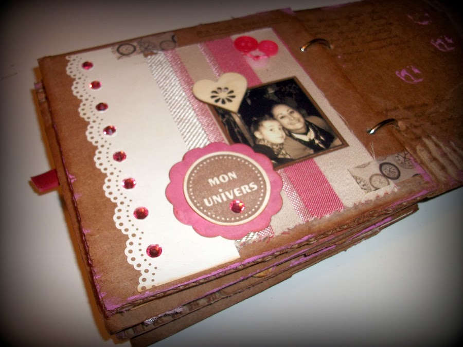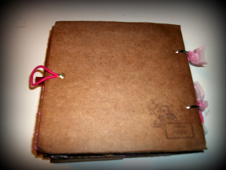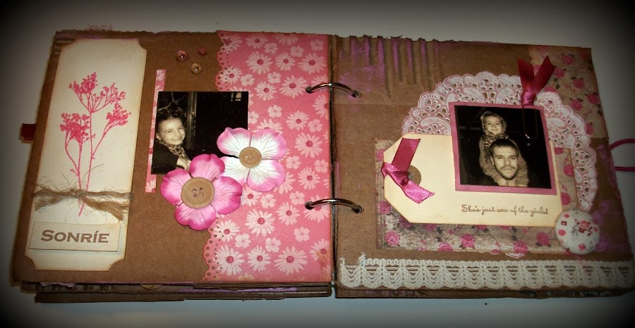 He usado cartón, pinturas acrílicas, y papeles de My Minds Eyes, diversos ornamentos como botones, puntillas y lazos, he decidido encuadernar con anillas y como cierre un boton con goma.