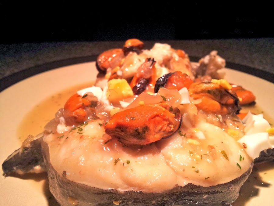 El dominio total y absoluto de elementos marinos de la receta, invitaba a mi alocada imaginación a hundirse en la cinematografía oceánica. Hay infinidad de ejemplos que dignificarían este plato pero viendo la grandeza y contundencia de un congrio cerrado, su enorme protagonismo y el acecho al que es sometido por parte de los mejillones, la idea de una batalla en el agua se apoderó de mí hasta materializarse en la gran ballena blanca del cine, es decir, en MOBY DICK.
