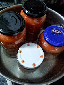 Mi huerto no es muy grande, ocupa un lugar pequeño en mi jardín, pero cada año que pasa le sacamos más partido, con nuestros tomates, pimientos, berenjenas, calabacin, incluso plantamos cebollas, y lo mejor de todo el olor que tienen, ese olor tan característico de lo sano y natural de un producto que no madura en cámaras que cuando lo llevas a la mesa su sabor es inconfundible y al cortarlo de la mata sigue oliendo. Pues bien el año pasado me dio por hacer mermelada de tomates, que termine regalando a la familia y amigos y este año he aprovechado para hacer conservas.