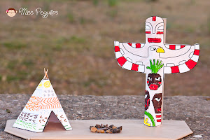 Aquí tenéis el poblado que hizo Pelusa, porque es infalible, si ve a mamá haciendo alguna manualidad, Pelusa se pone en paralelo a hacerla también. Luego como se siente tan orgulloso de su trabajo se lo lleva al cole para enseñárselo a sus compis, que además se llevó las plantillas para que todos hicieran su Tipi y su Totem en clase.