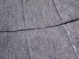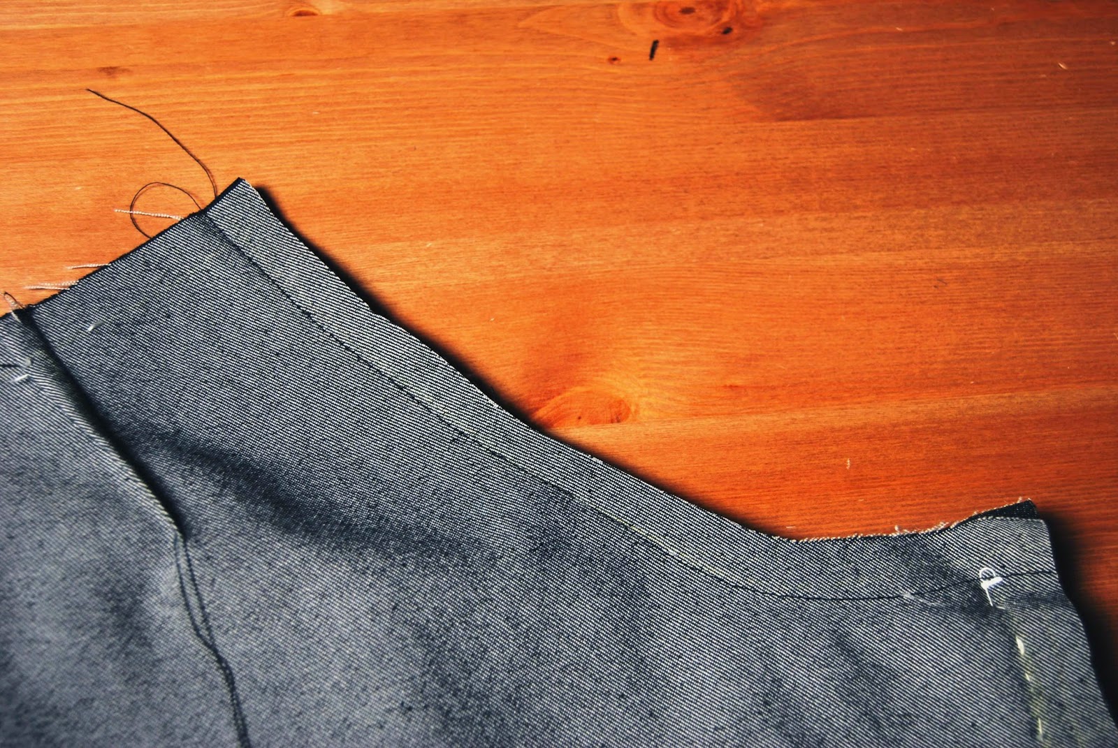 Remetemos la vista del canesú en el interior para que quede alineada con la parte baja del canesú del pantalón por su parte interior y la hilvanamos para pasar un pespunte por la parte exterior que lo deje fijado.