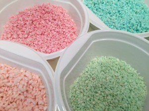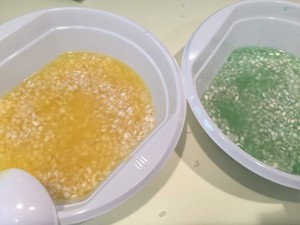 En un bol, pon un poco de agua, la cantidad necesaria para cubrir el arroz o la pasta o el material que quieras colorear, añade unas gotas de colorante y remueve bien para que se disuelva y mezcle bien. Intenta que el color del agua sea bastante fuerte ya que luego pierde un poco de color.