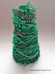 7.- Decoramos el árbol a nuestra elección. He utilizado unas tiras de cuentas en dorado y rojo. Colocamos la estrella.