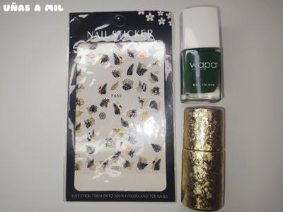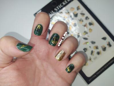 Vuelvo por aquí para enseñaros un diseño de uñas en verde y dorado con pegatinas y muy fácil de hacer en casa. Si os interesa, seguid leyendo…