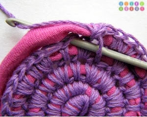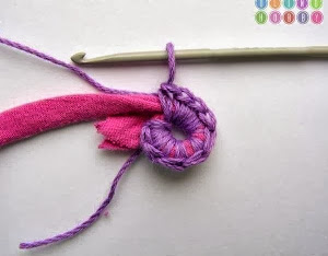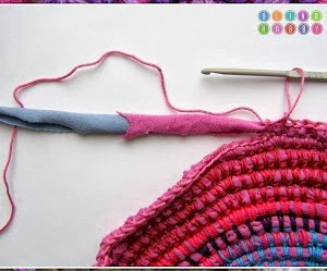 Cuando hayáis dado la vuelta tenéis que unir el final de la vuelta con el principio utilizando un punto bajo, procurar siempre que el trapillo quede en medio del punto , como si estuvierais forrando el trapillo.