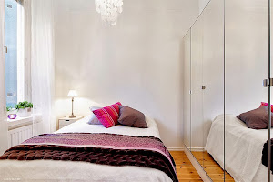 Los armarios preferiblemente sin molduras y en colores muy caros, lo ideal es con cristales o espejos. Solucionaras el problema de apertura con puertas estrechas y plegables o correderas, o ambas combinadas.