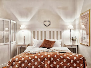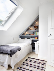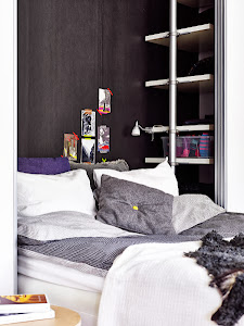 En ocasiones los dormitorios son tan escasos de dimensiones que no podremos ubicar ni una mesilla, por lo cual una buena solución será aprovechar la zona del cabecero para colocar baldas y armarios.